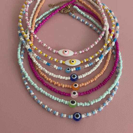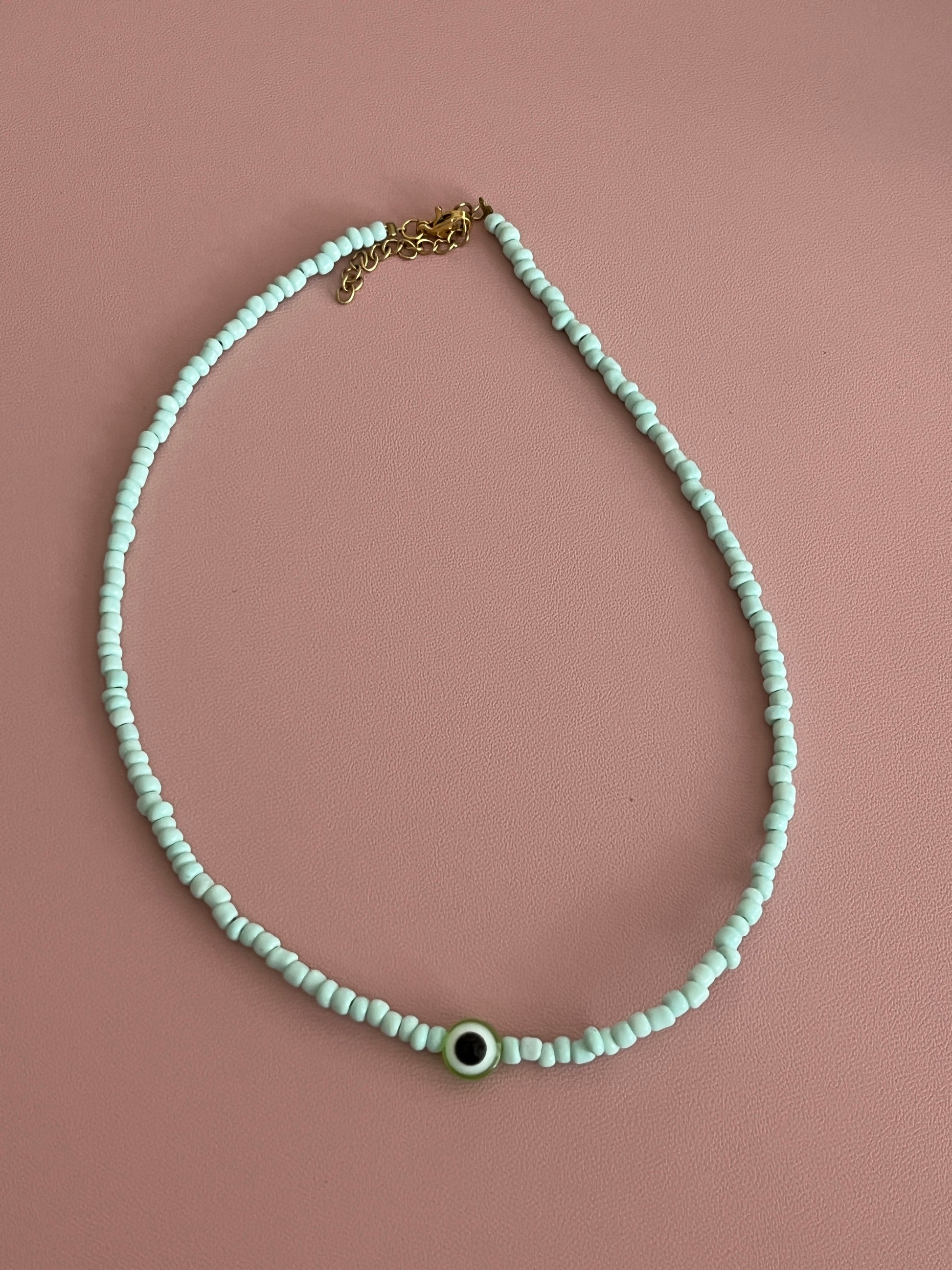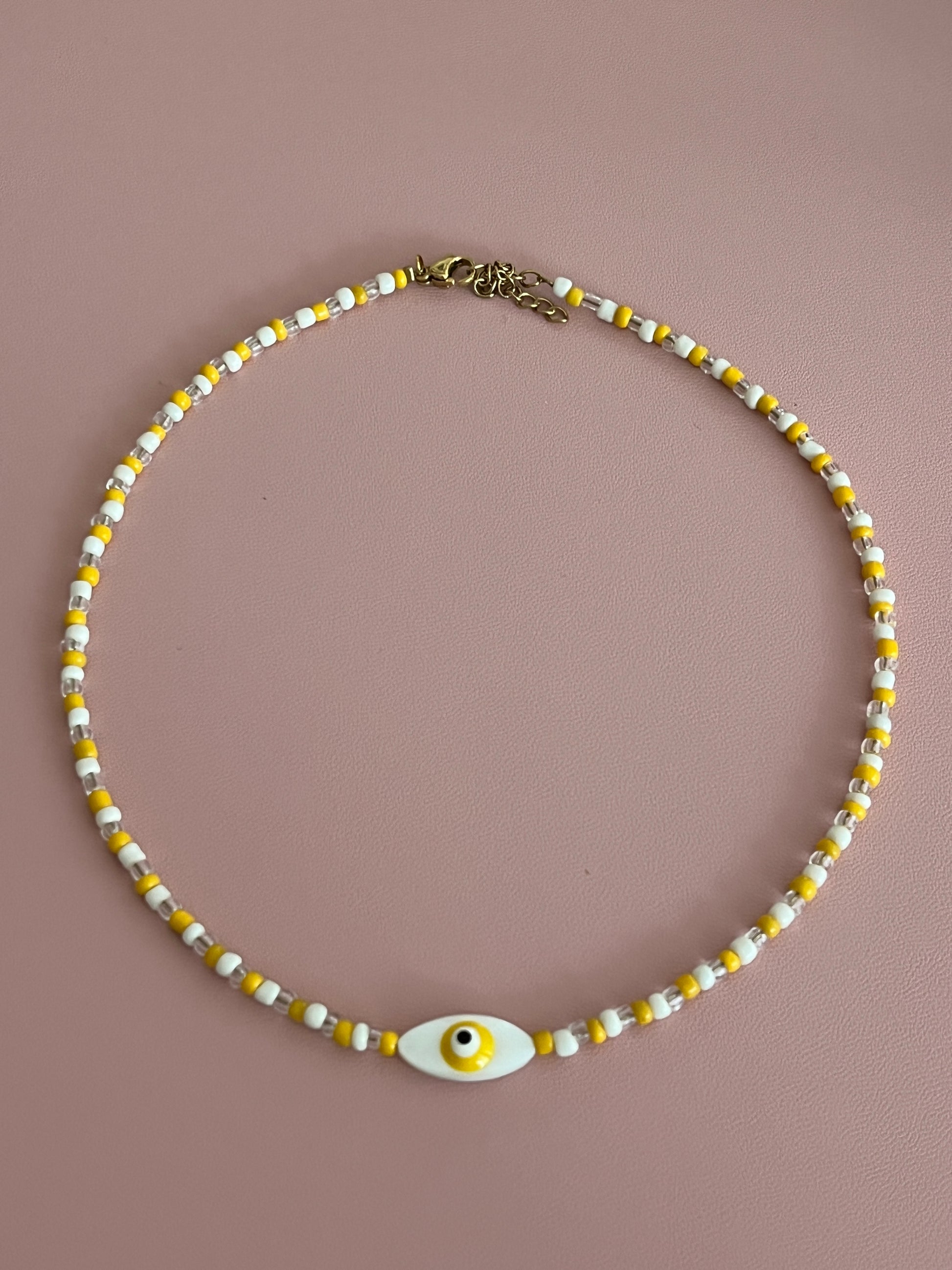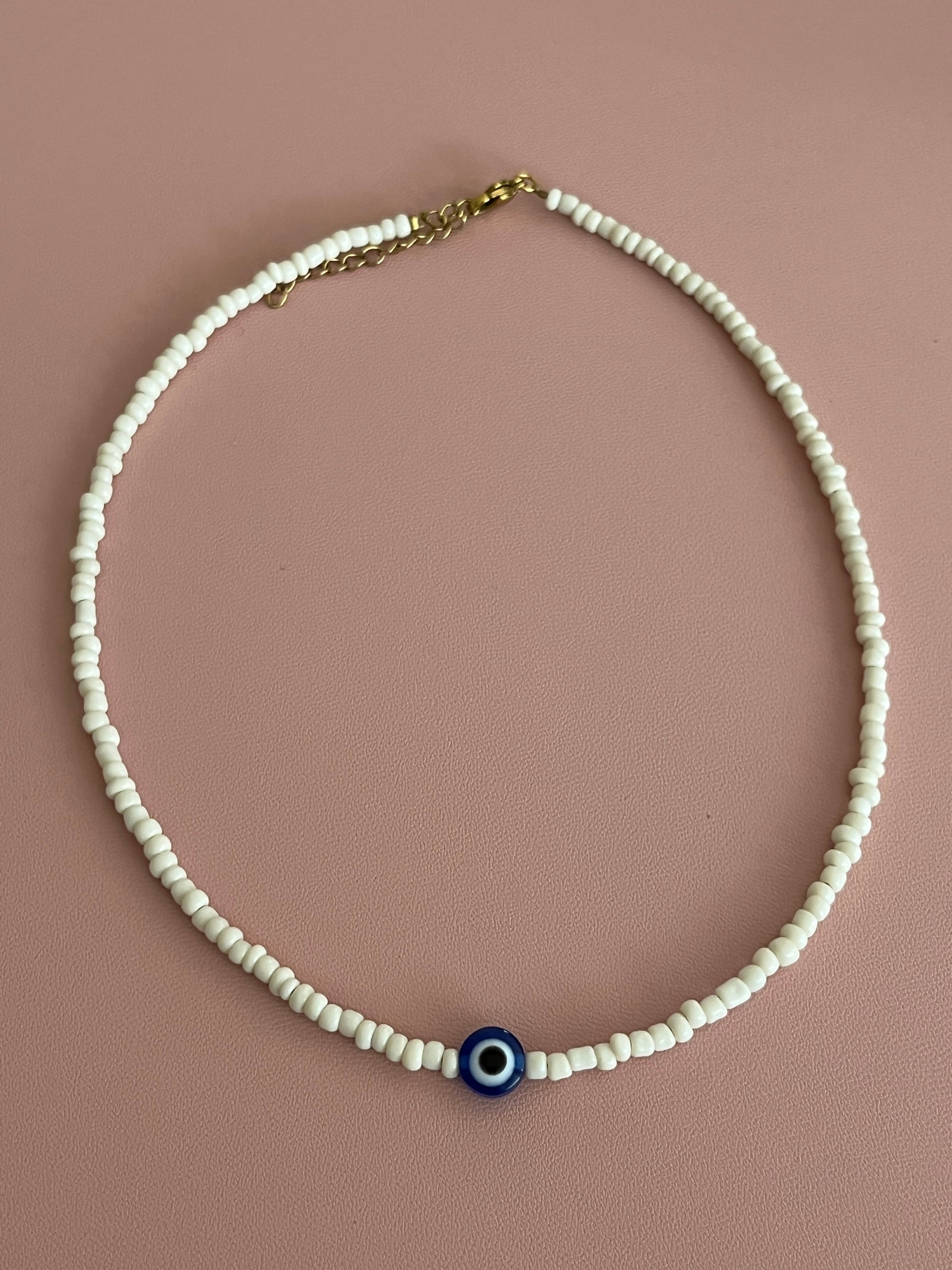 - Ce collier en perles de rocailles dispose d'une perle oeil au milieu.