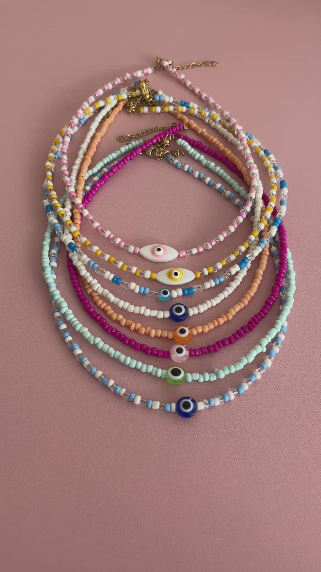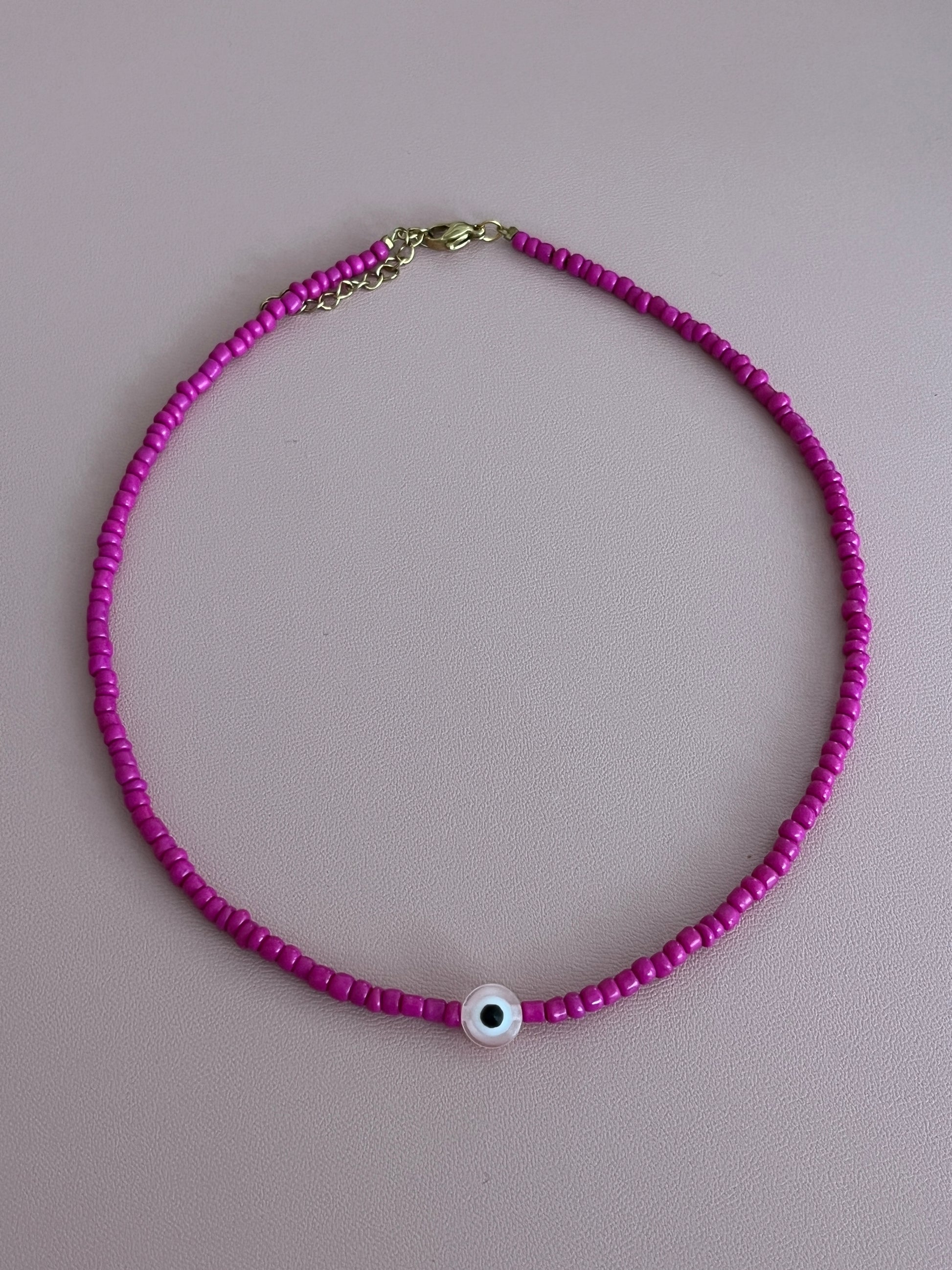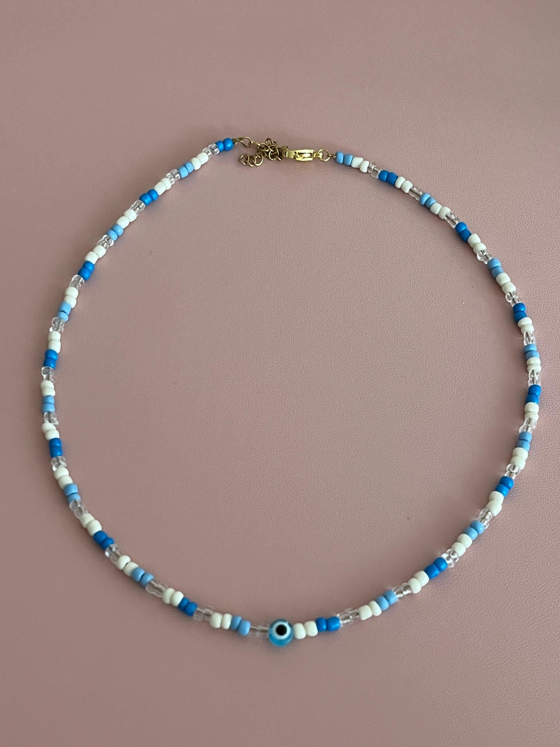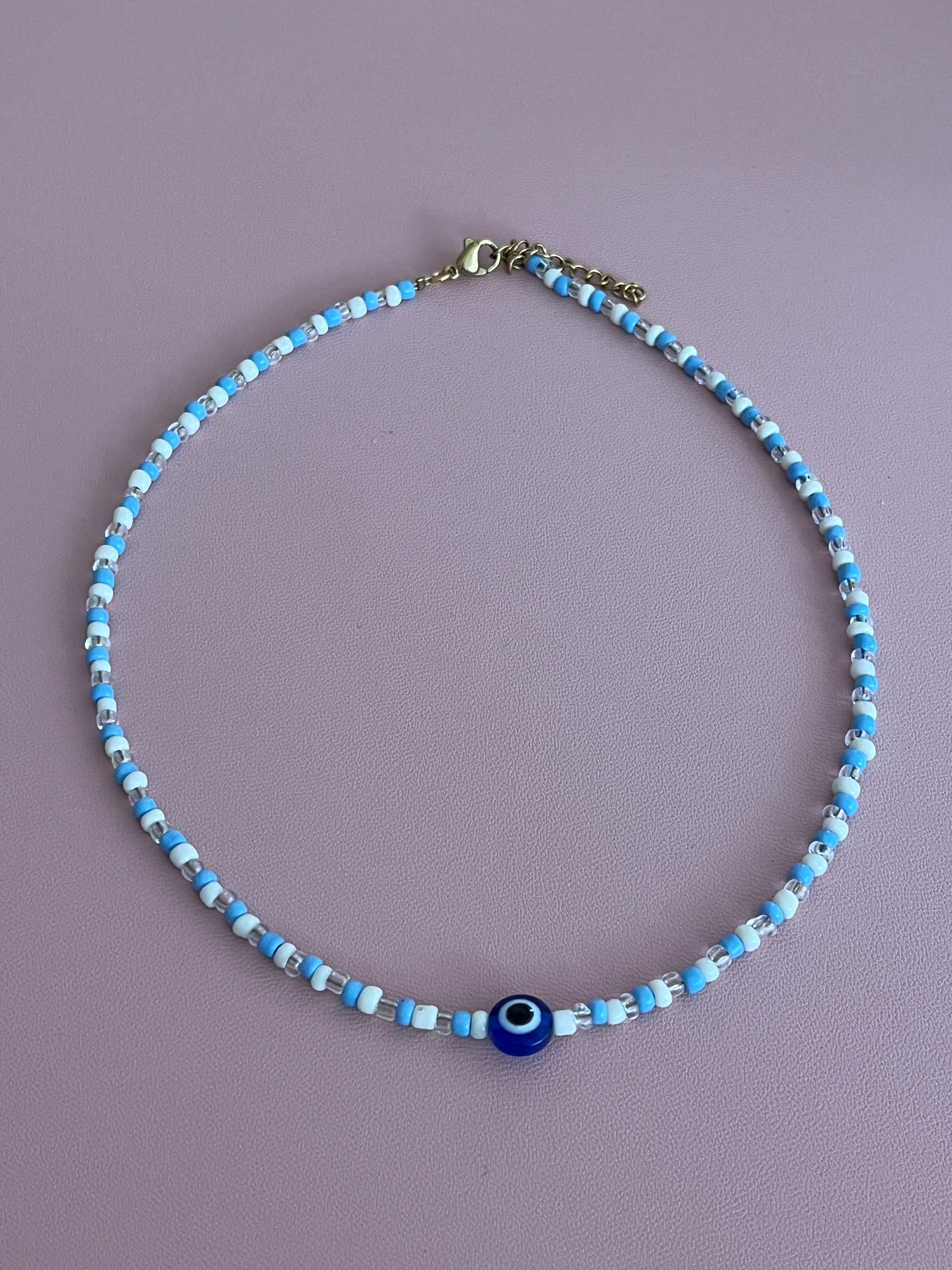 - Ce collier en perles de rocailles dispose d'une perle oeil au milieu.