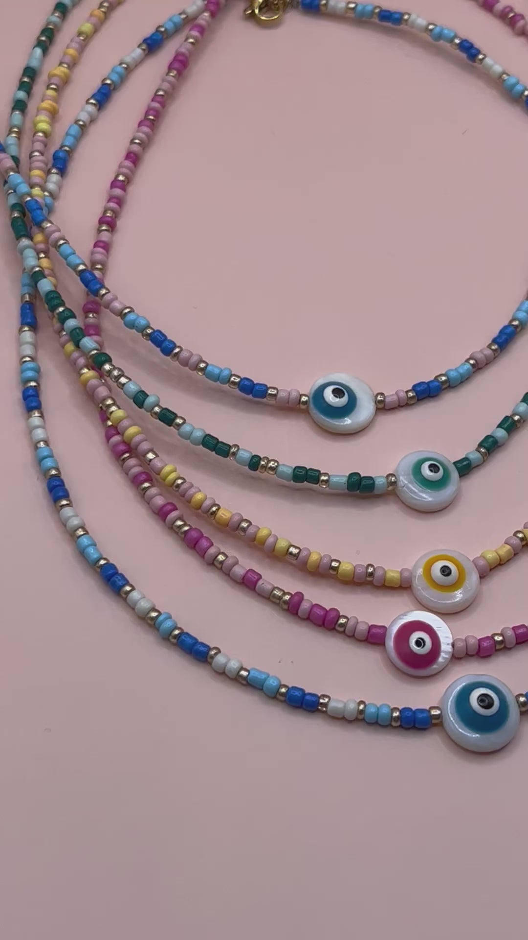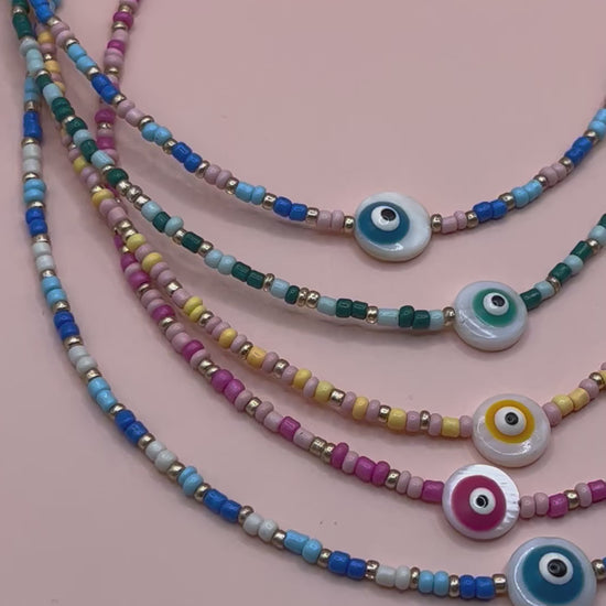 - Ce collier tendance ras-de-cou est composé de perles de rocailles et d'une perle de nacre mauvais oeil.
